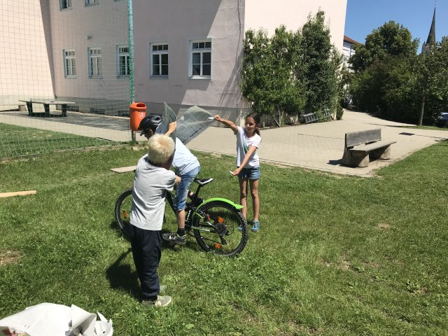 Die beiden zweiten Klassen hatten Gelegenheit im Pausenhof mit dem Fahrrad zu üben. Bei einem Rundparcours konnten sie beweisen, ob sie Slalom, einhändig fahren, die Spur über einem Brett halten oder vor einer Haltelinie rechtzeitig bremsen konnten. Bei herrlichem Sonnenschein radelten die Zweitkläs …mehr